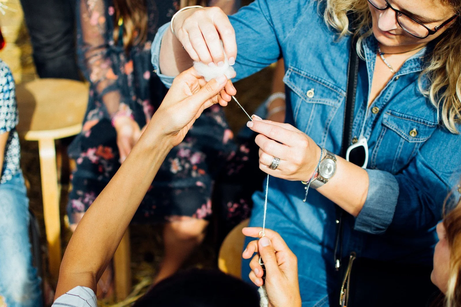 Demonstração e experimentação de todo o processo de preparação da fibra da lã, da ovelha ao fio.
