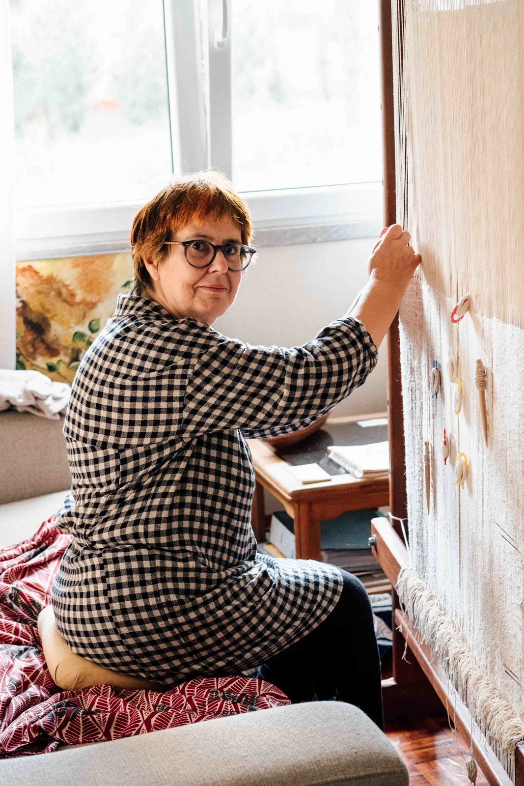 Alice Bernardo é a nossa coordenadora de aprendizagem, educação e capacitação e especialista na transmissão de conhecimentos técnicos em trabalho artesanal, produção semi-industrial e produção de fibras têxteis.