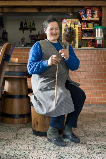 On one of my trips to Salto, with the purpose of visiting the Pisão de Tabuadela (The Tabuadela Wool Stomping Facilities), where the last burel blankets made by the Women of Bucos were felted, I had the chance of meeting D. Benta. Standing at the door of her café, she told me about how she spins her wool without washing it first and showed me a trick she uses to keep the yarn firmly set on the spindle and taught me how to ply two strands using a regular spinning spindle.