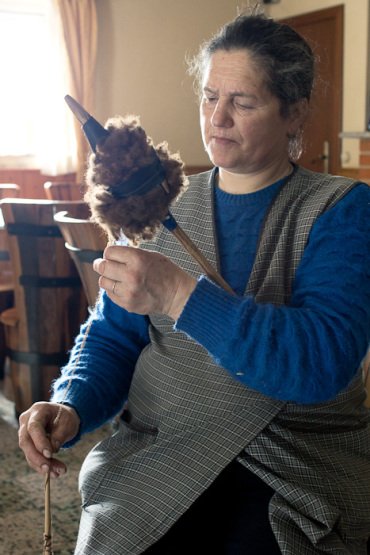 Numa ida a Salto, com o propósito de visitar o Pisão de Tabuadela, onde foram apisoadas as últimas mantas de burel feitas pelas Mulheres de Bucos, tive a oportunidade de conhecer a D.Benta. À porta do seu café, falou-me da forma como fia a lã ludra, mostrou-me um truque que usa para manter a maçaroca bem firme no fuso e ensinou-me a torcer dois fios usando um fuso normal.