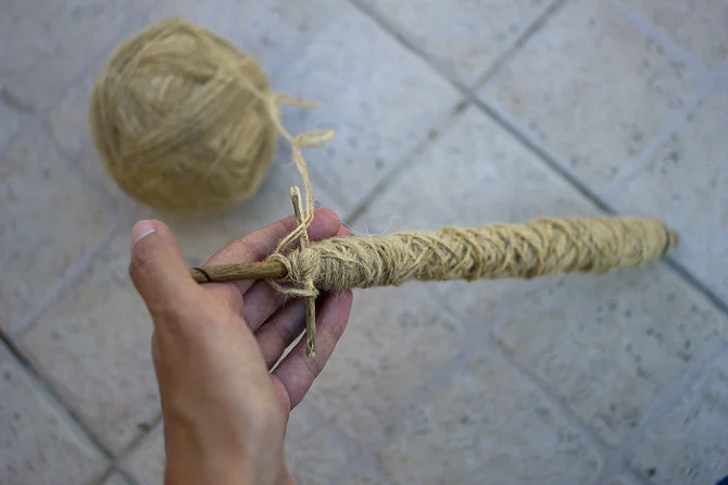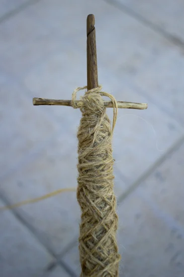 While spinning, the wool on the spindle keeps growing and to stop it from falling, D.Benta has a small trick she uses to fix it.