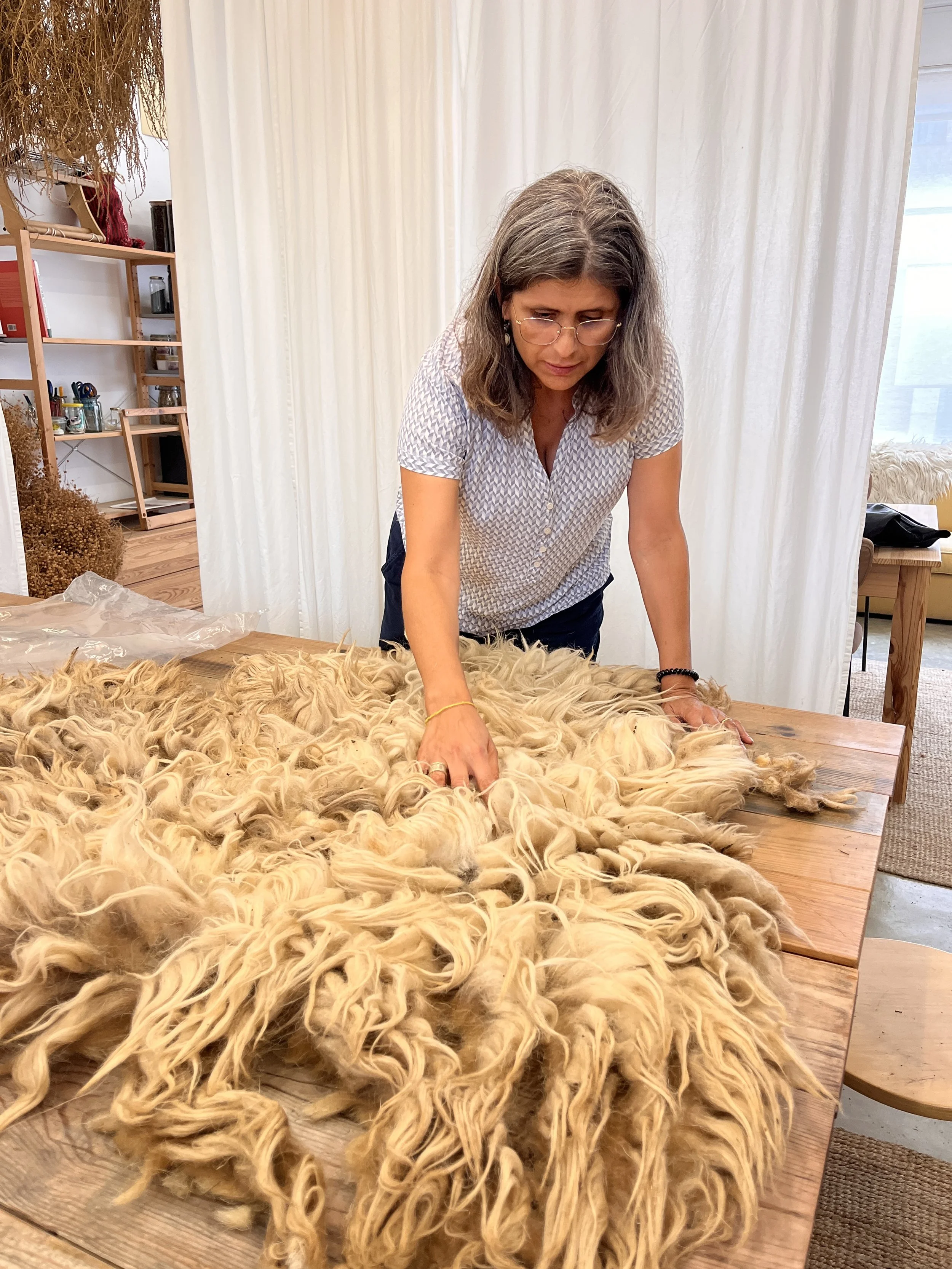 Desde então que nos temos mantido em contacto e há umas semanas a Carolina veio trazer-nos alguns belos exemplares de velos de Churra Algarvia para juntarmos ao nosso grande arquivo das lãs portuguesas, que usamos para investigação e nas nossas formações também.